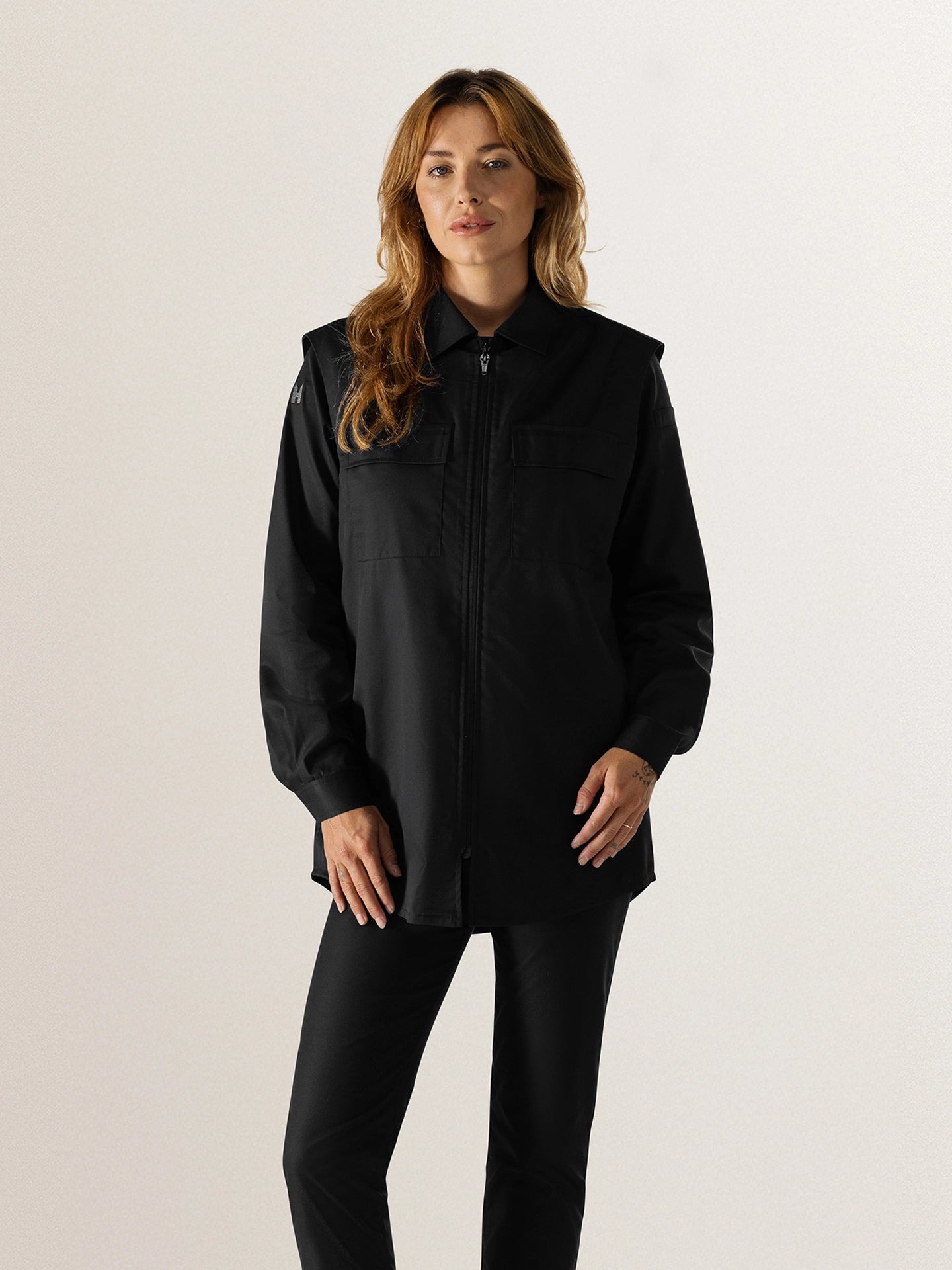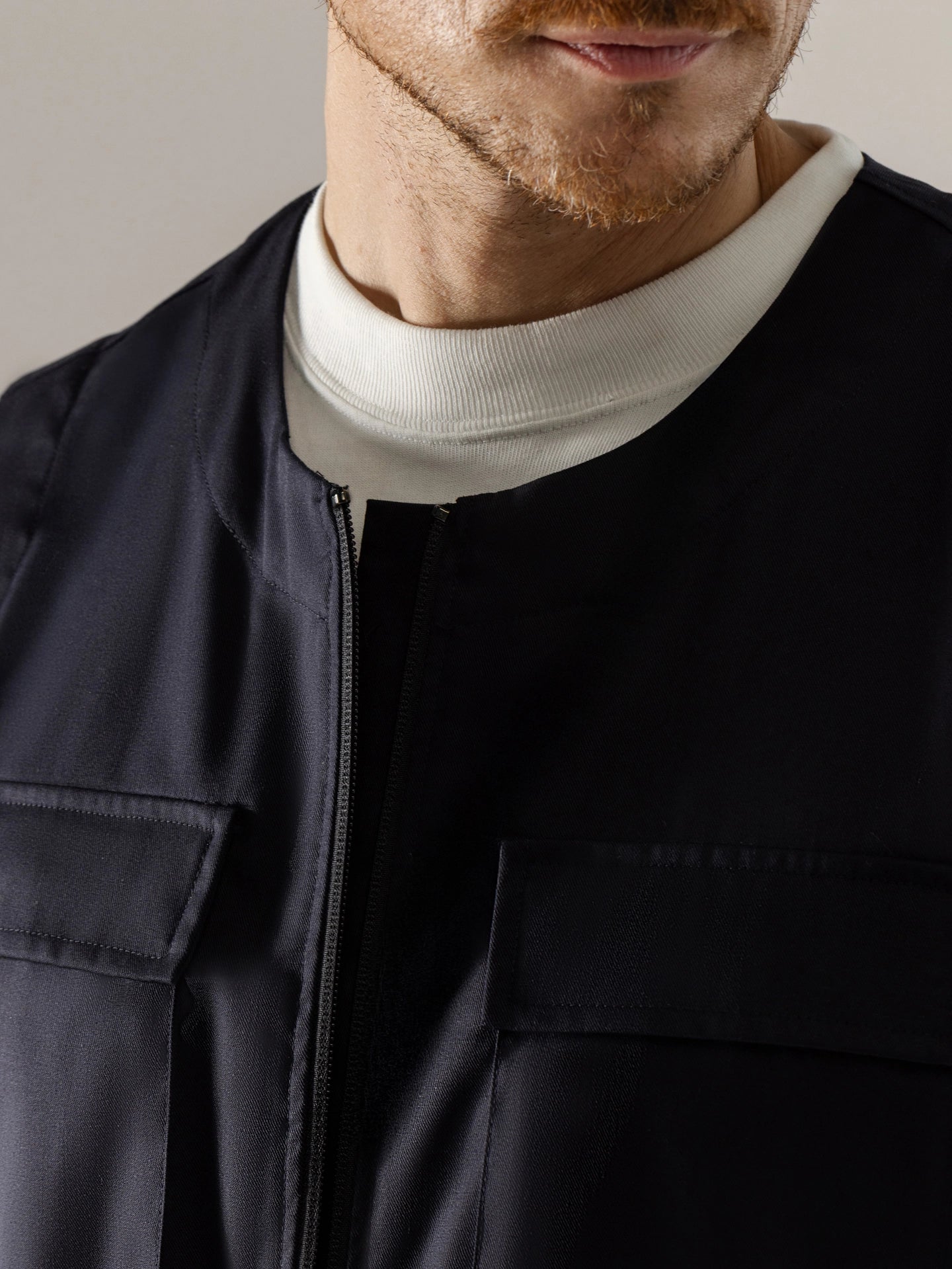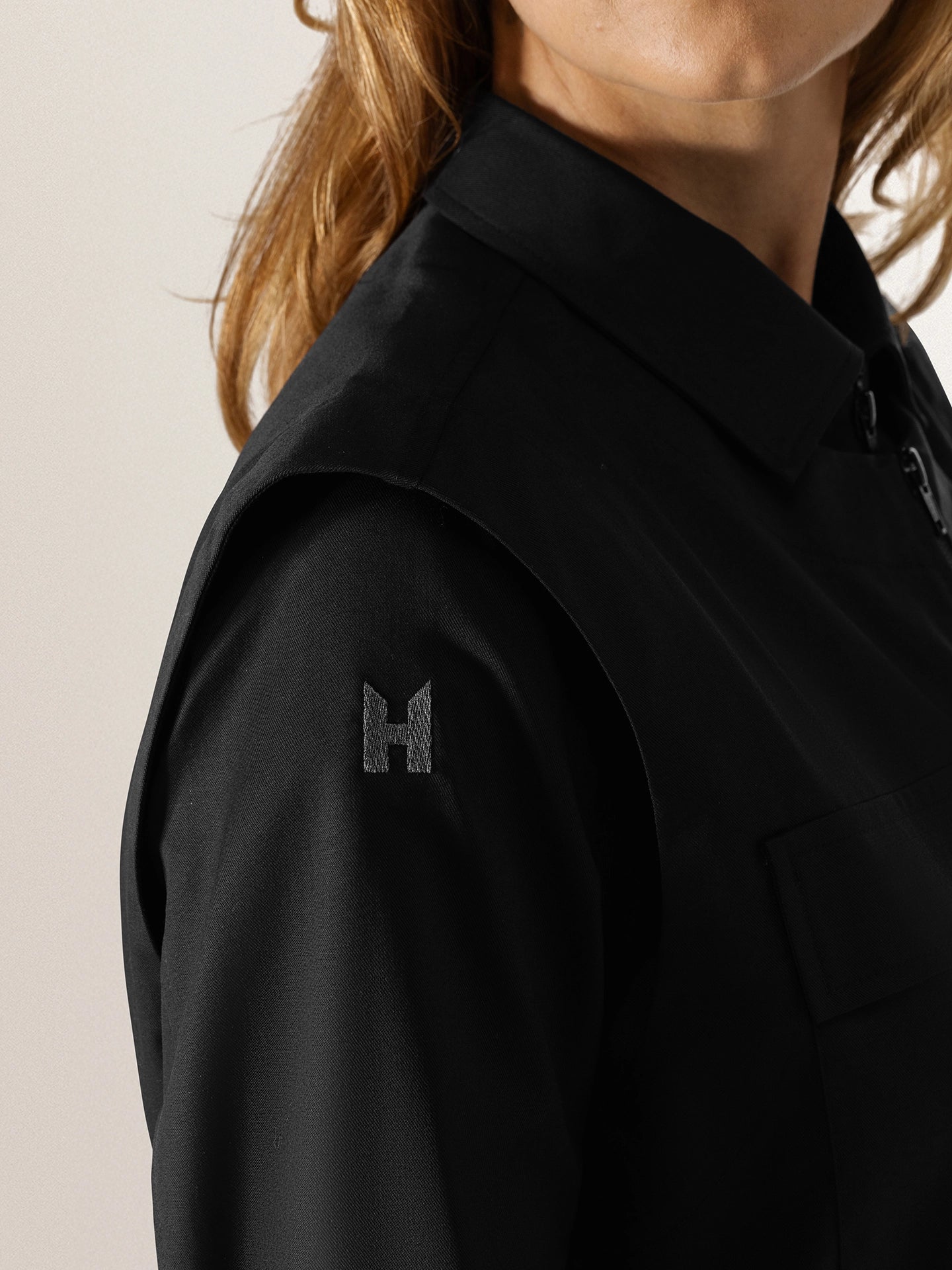 | Product features | Low-cut armholes for extra freedom of movement Perfect for the kitchen service or casual wear Sturdy front zipper Two utility chest pockets with flaps Can be worn over a T-shirt or chef’s jacket in the kitchen or beyond Round collar |